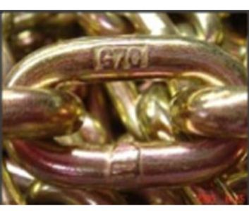Grade 70 chain is easily identifiable by its usual gold finish. Unlike general utility chains Grade 70 chain will have an identifier embossed indicating the grade at least every foot.